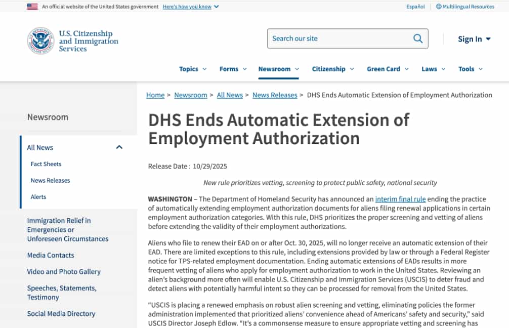 自 2025 年 10 月 30 日起,美国国土安全部(Department of Homeland Security,简称 DHS)宣布不再为多数在美国公民及移民服务局(U.S. Citizenship and Immigration Services,简称 USCIS)续办工作许可(Employment Authorization Document,简称 EAD)的非公民申请者提供自动延长期限。此举意味着,若申请人在 10 月 30 日或之后提交续办申请,其旧许可到期后将不再自动获得延长。该规定不影响 10 月 30 日前已获得自动延长的案件,或特定受法律保护的群体(如临时保护身份 Temporary Protected Status,简称 TPS 受益人)。此政策将影响所有依赖工作许可(EAD)合法就业的移民群体,申请人需提前规划续签时间以避免工作中断。