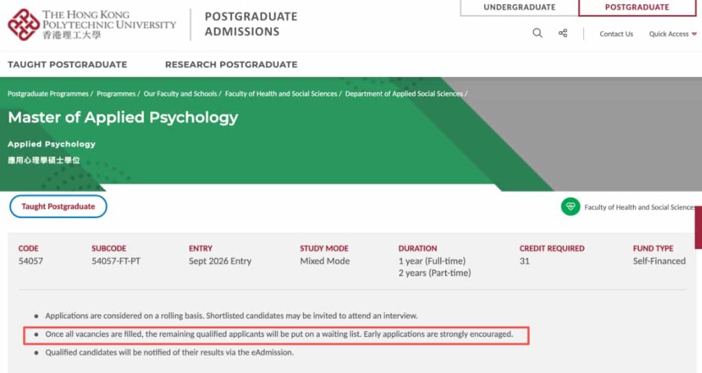 2026 年秋季入读香港研究生项目的申请已于 10 月底全面开放,涵盖大部分学校和专业。高校提示,尽管官方申请截止日期为 2026 年年初,但港硕项目通常额满即止,意向申请人应尽早提交申请。全日制硕士课程不仅提供中英文授课选择,还可为家庭成员带来香港居留便利。如持有本科双证且具 3 年以上工作经验的申请人,可联系环球出国进行专业评估。