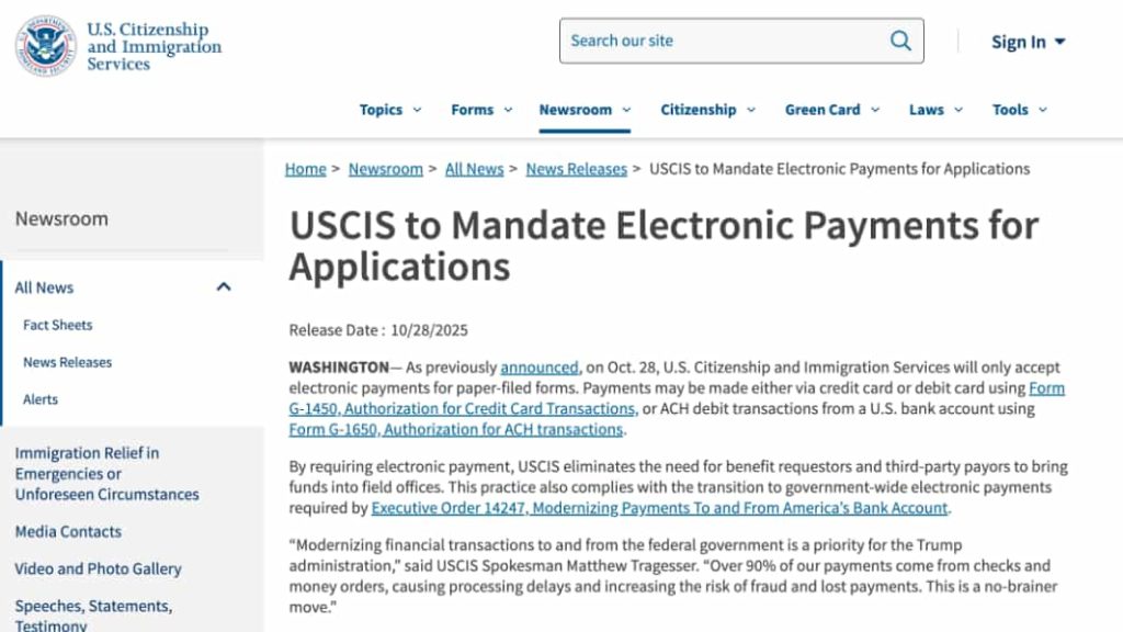 从 2025 年 10 月 28 日起,USCIS 将要求所有纸质提交的申请表仅接受电子支付,不再接受支票、汇票或其他传统形式的付款。 申请人必须通过信用卡或借记卡使用表格 G-1450,或通过美国银行账户自动清算(ACH)使用表格 G-1650 来完成费用支付。 USCIS 表示,此举旨在减少传统纸本支付带来的延迟与人为风险,提高支付流程的安全性与效率。 为那些确有特殊原因无法使用电子支付的申请人,仍可通过填写豁免表格 G-1651 提交申请。