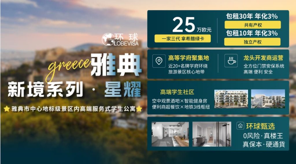 环球出国联合希腊 63 年龙头开发商 V²,针对独家【星耀】项目推出 “欧洲 5 年体验权”。11 月 30 日前签约客户,满 5 年可享开发商原价回购,5 年期间每年还能获 3% 固定收益。开发商自持 30% 产权,并有商业品牌入驻,客户 5 年后可自由选择退出或保留身份,灵活解决房产 “套牢” 顾虑,环球品牌全程保障。