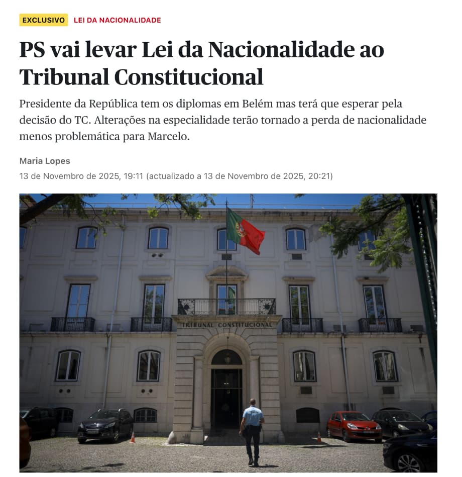 葡萄牙国籍法案由议会通过后,已于11月11日将终版送往总统府,正式进入倒计时,总统有8天时间把提案给宪法法院,有20天时间作出决定,签字或者驳回。同时,社会党议会党团将请求宪法法院对目前正在由共和国总统审议的新国籍取得和丧失规则进行预防性审查。