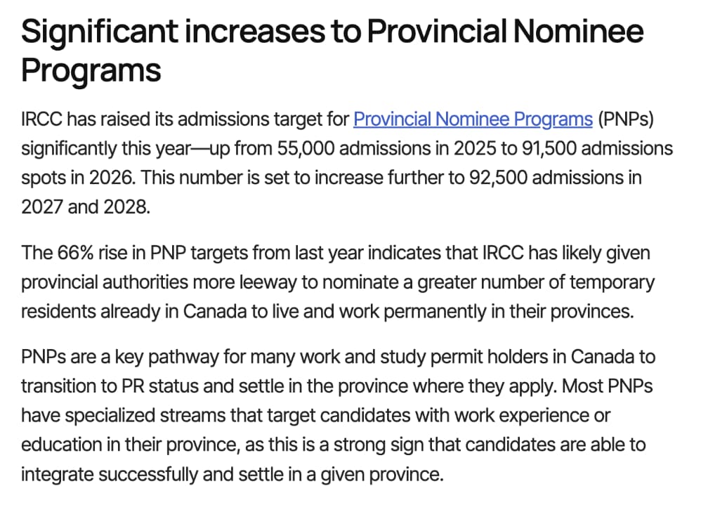 与此同时,加拿大2024-2026年移民水平计划显示,省提名配额较2025年大幅提升66%。新政明确优先考虑已在加境内的临时居民,包括工签和学签持有者,