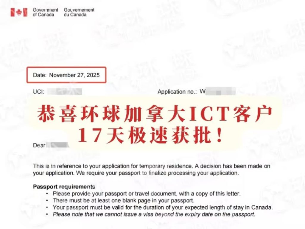 环球出国近日协助一位持有新加坡EP且曾有加拿大拒签史的客户,仅用时17天即无补料极速获批ICT工签!面对客户复杂的跨国架构及特殊的运营背景,环球文案团队凭借20+年深厚积淀,精准梳理母公司教育行业与加拿大子公司游学业务的商业逻辑,构建出无懈可击的商业计划,成功消除移民官对过往拒签及公司背景的疑虑。此次获批再次印证,加拿大ICT项目无硬性语言及年龄门槛,只要商业逻辑过硬,环球1V1定制方案定能助您化繁为简,实现快速登陆。