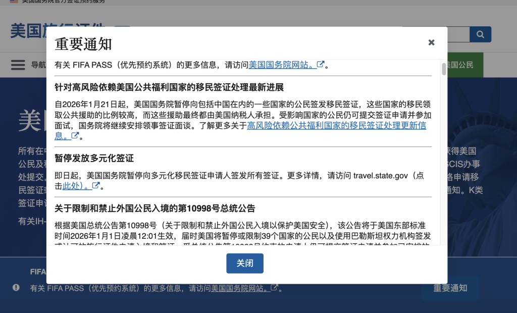USTravelDocs 官网弹窗误将中国列入美国移民签证受限名单,引发市场高度关注与客户焦虑。环球出国美国团队第一时间核查确认:美国国务院 2 月 2 日最新官方清单不含中国,1 月 21 日后仍有中国籍申请人成功获签。2 月 11 日,该网站已删除错误提示,警报正式解除。