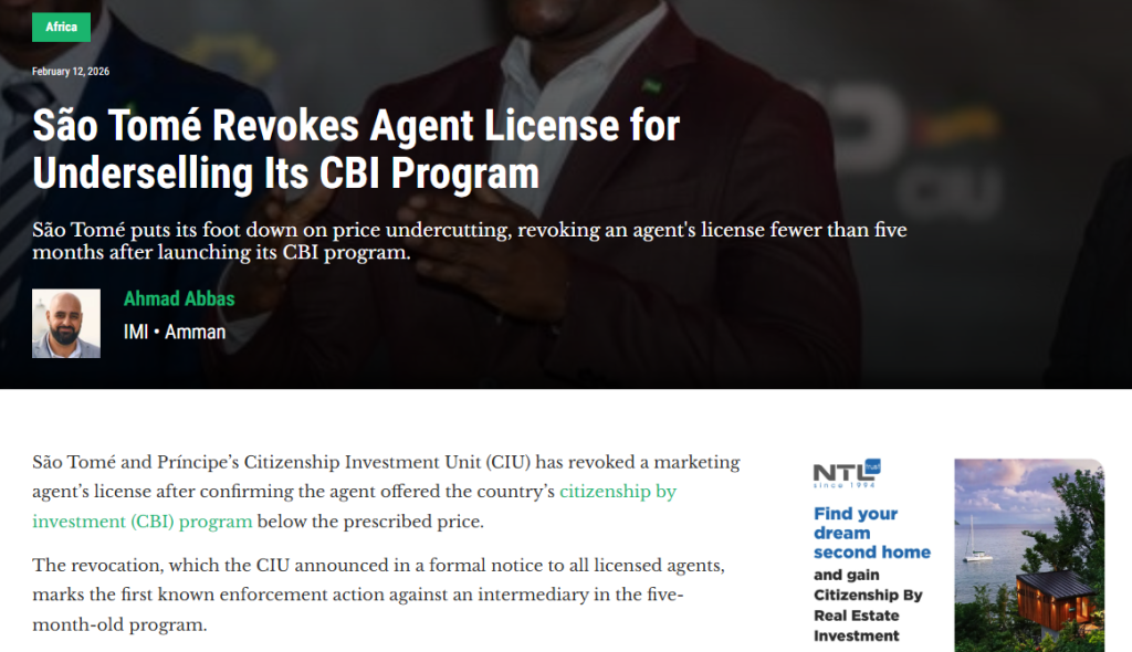 圣多美和普林西比政府负责投资入籍计划(CBI)的机构吊销了一家代理商的执照,原因是该代理以低于官方规定价格(USD 89,000)推销和签约该计划,违反了代理协议规定。官方要求单个申请人应按规定捐款90,000美元,加上申请费与行政费总共95,750美元。此次是该项目推出五个月以来对中介的首个执法行动,并被用于强调政府对违规行为的零容忍态度。政府重申将继续监控合规情况以保护计划的信誉与透明度。