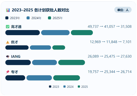 根据香港入境事务处最新公布数据,2025年香港四大人才计划共获批92,953人,较前两年高位回落,但结构分化明显。高才通以31,508宗继续居首,仍是主力通道;优才获批7,101宗,同比下降近40%,筛选趋严信号清晰;IANG获批27,630宗,保持稳定,硕士仍为留港主力;专才达26,714宗,逆势增长并创近年新高。