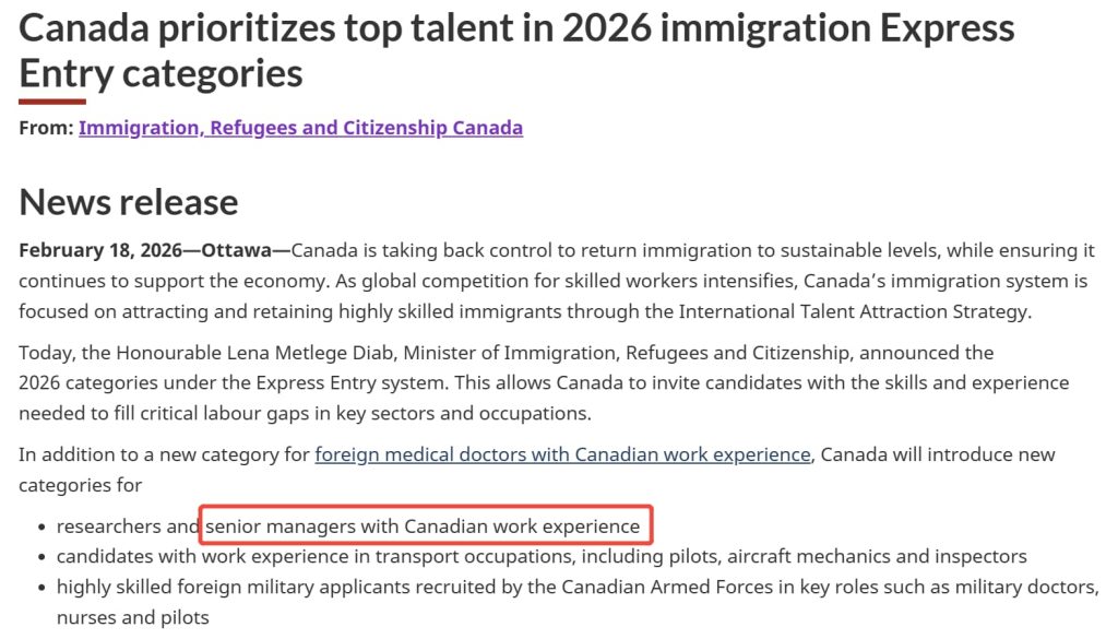 近日,加拿大移民局宣布Express Entry(EE)快速通道新增定向邀请类别,正式将“拥有加拿大工作经验的高管”纳入其中。新政重点定向邀请高管人才(涵盖财务、健康、贸易、建筑等领域),核心门槛仅需1年加拿大境内高管经验。