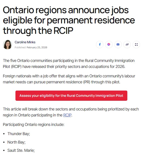 2026 年 2 月 25 日,加拿大 CIC News 发布消息称,安大略省北湾、雷湾、苏圣玛丽等五大参与农村社区移民试点项目(RCIP)的地区,正式公布 2026 年可申请永久居留的优先职业清单,该通道门槛更低,本地留学生还豁免 3 年工作经验, 毕业后 凭试点地区指定雇主全职 offer 即可申请 PR 。这一更新为安省硕士毕业生移民加拿大开辟了除省提名(OINP)和联邦EE外的另一路径,高学历人才获得加拿大永居的移民通道进一步拓宽;加之加拿大硕士毕业可获 3 年工签,学签不受配额限制、免 PAL 省级确认信,多重利好同步落地。现在规划入学,正是移民布局的最佳时机。
