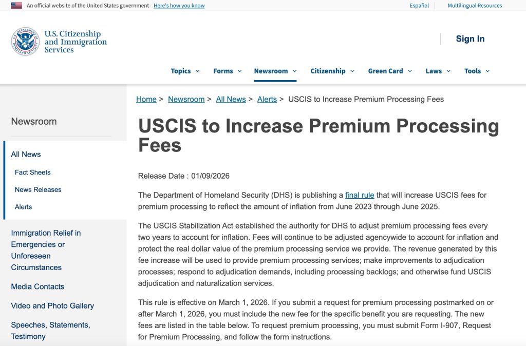 来源:https://www.uscis.gov/newsroom/alerts/uscis-to-increase-premium-processing-fees