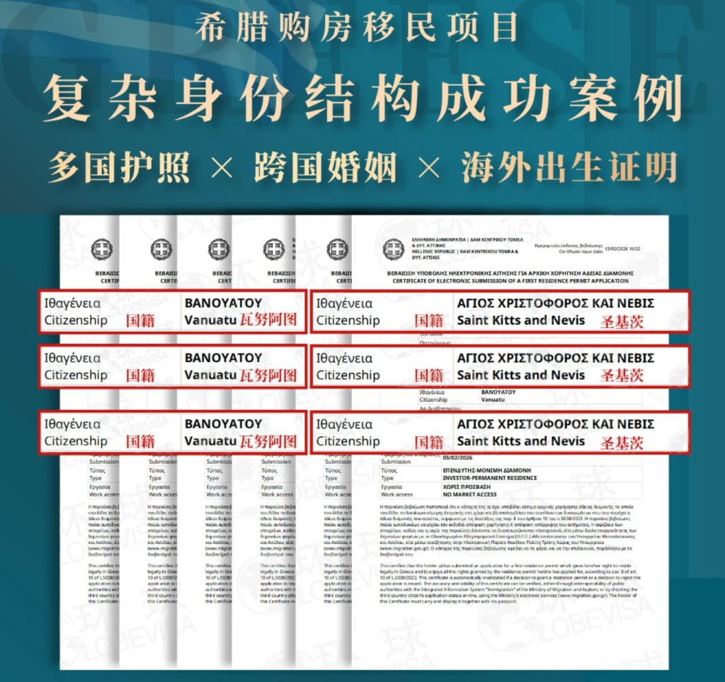 近日,环球出国成功协助一组持有瓦努阿图、圣基茨等多国护照,并涉及跨国婚姻与海外出生证明的家庭,顺利获批希腊永居。