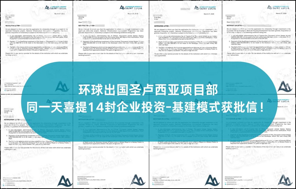 圣卢西亚投资入籍计划(CIP)再次传来重大利好!本周,环球出国圣卢西亚企业投资—基建项目模式迎来大规模“团批”时刻。在同一天内,共有14组客户同步收到圣卢西亚移民局发出的正式获批函。作为圣卢西亚移民局官方认证的“市场代理(Marketing Agent)”,环球出国凭借庞大的客户基数与深厚的官方沟通机制,通过高端文案团队对申请材料的严苛把控与专业递交,确保项目保持较高的审批效率与获批率。此次大规模“团批”不仅是客户对环球专业度的信任回馈,更是我司在加勒比投资移民领域专业服务与深耕官方关系的证言——在项目转瞬即逝的窗口期,环球出国始终是客户实现身份规划稳健的护航者。
