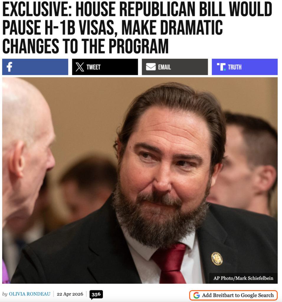 来源:https://www.breitbart.com/immigration/2026/04/22/exclusive-house-republican-bill-would-pause-h-1b-visas-make-dramatic-changes-to-the-program/