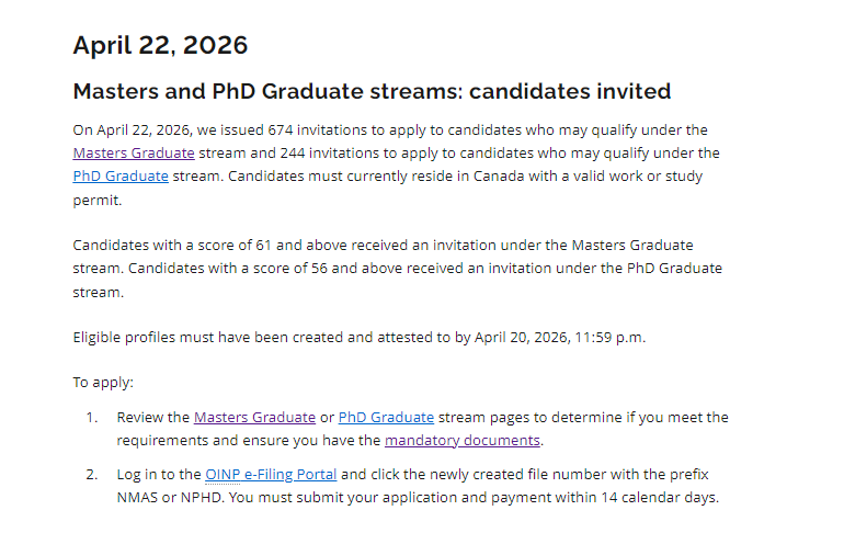 2026年4月22日,加拿大安省硕博通道筛选,硕士61分,674份申请;博士56分,244份申请,这次是常规筛选,满足分数即可筛中