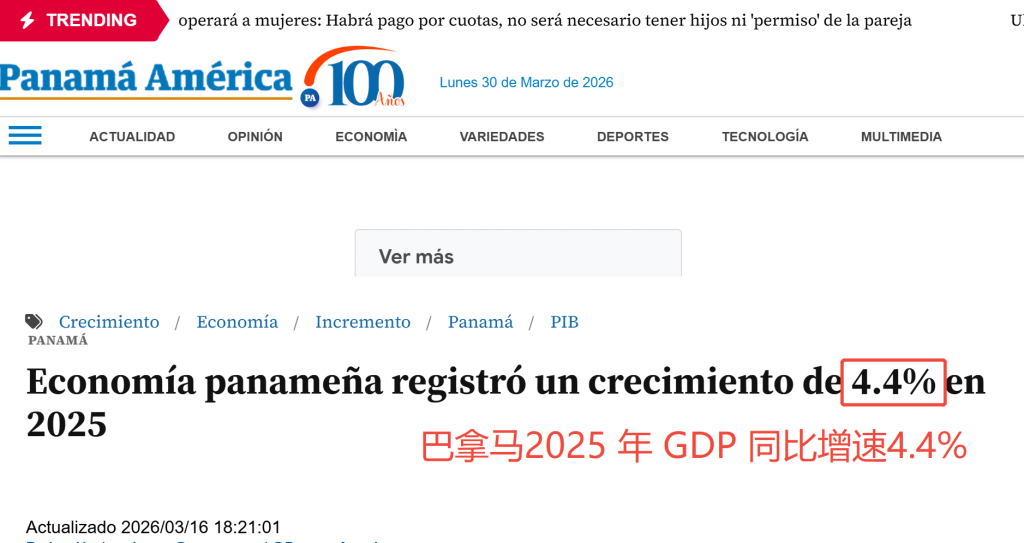 来源:Panama America官网|Economía panameña registró un crecimiento de 4.4% en 2025,2016/03/16