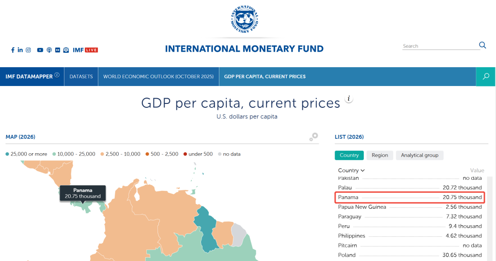 人均 GDP 表现卓越: 根据国际货币基金组织(IMF)2026 年的最新预测,巴拿马人均 GDP 已达 20,750 美元。这一数据显著高于秘鲁、巴拉圭等周边国家,进一步确立了其全球中高收入经济体的地位(数据来源:IMF 2026 World Economic Outlook)。
