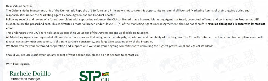近日,投资移民行业(CBI)爆出重磅消息:圣多美和普林西比(São Tomé and Príncipe)投资入籍局(CIU)正式发函,宣布撤销一家授权代理机构的牌照,且即刻生效!
