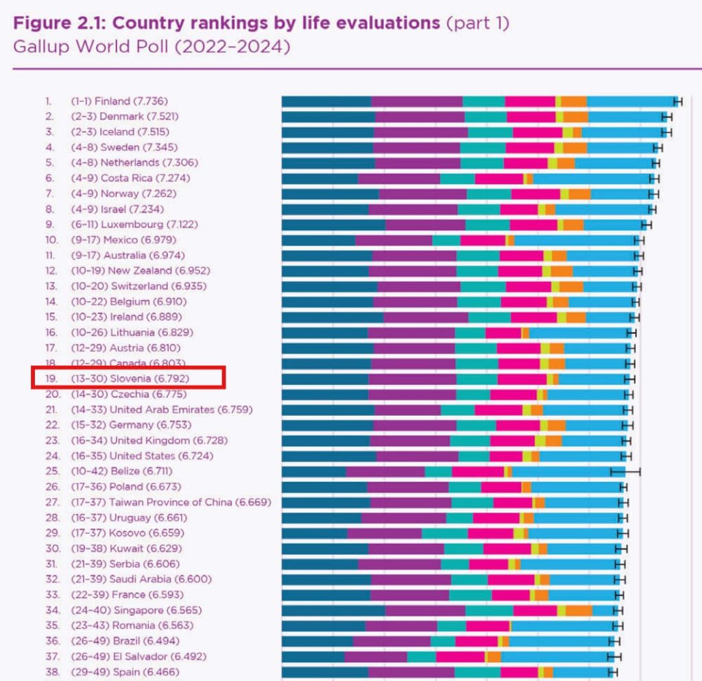 根据《World Happiness Report 2025》,斯洛文尼亚在全球幸福指数中排名第 19 位,幸福得分约 6.8/10 分。作为参考,目前全球幸福指数高的芬兰得分为 7.7 分。虽然斯洛文尼亚并非排名前的国家,但其整体水平已明显高于全球平均值,在欧盟成员国中同样表现突出。这一较高的幸福感并非偶然,而是长期形成的结果,源于社会整体信任度较高、公共服务体系完善,以及工作与生活节奏相对平衡的生活方式。这也说明,斯洛文尼亚不仅在经济和社会运行上保持稳定,也为居民提供了持续、可感知的生活安全感与幸福感。