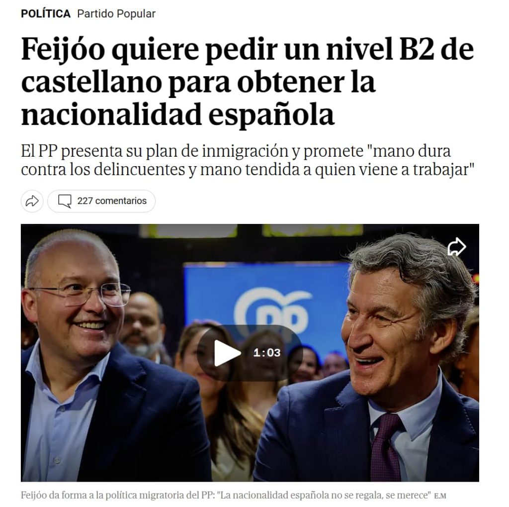 关键新闻摘要:西班牙人民党(PP)代表人物费霍(Feijóo)强调,未来的移民政策必须建立在“权利与义务对等”的基础上。提案建议,在续签或申请长期居留阶段,申请人需证明其具备B2级别的西班牙语能力以及通过宪法与社会文化知识测试。