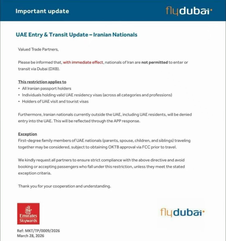 2026 年 3 月 28 日,Flydubai 发布的紧急通知在身份规划行业引发了剧震:即便持有阿联酋长期居留签证(Residence Visa),特定身份人员仍被限制入境或经迪拜中转。