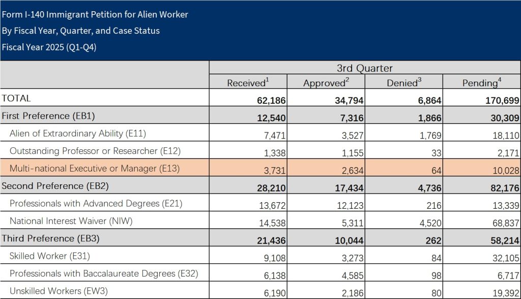更锦上添花的是,作为L-1A的目标,EB-1C绿卡申请阶段的数据同样无可挑剔。报告显示,批准率竟高达97.6%(2,634份批准,仅64份被拒)!这证明只要L-1A阶段基础扎实,获批绿卡的确定性高。
