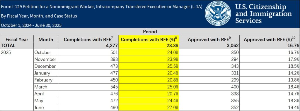 在高批准率的背景下,补件通知(Request for Evidence, RFE)的比例也提示我们,移民局的审核正变得愈发细致。数据显示,近四分之一的申请收到了RFE,且比例逐月攀升,从1月的20.4%增长至6月的27.0%。