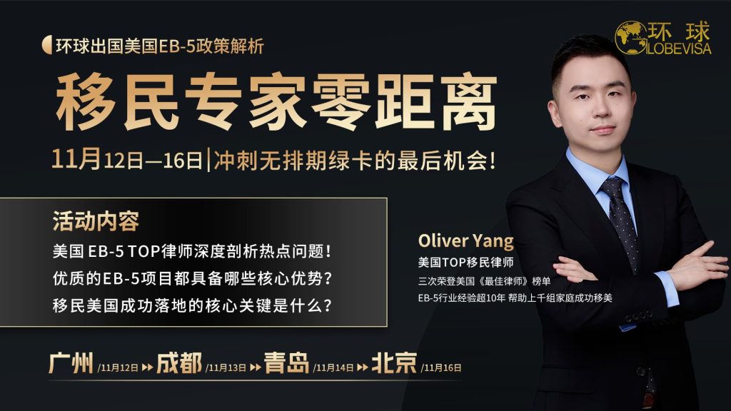 该活动将在11月12日 – 16日覆盖四城:广州(11.12)、成都(11.13)、青岛(11.14)、北京(11.16)。无论您是EB-5“新手”还是“进阶者”,Oliver的专业解析都将为您的移民之路扫清障碍。