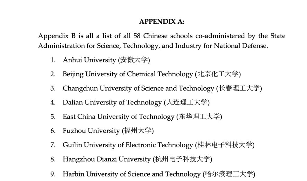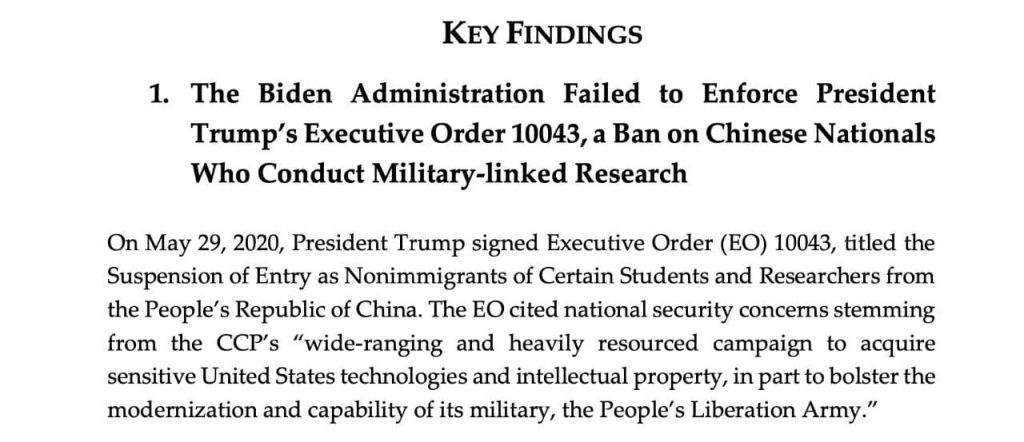 报告还批评前美国总统政府未有效执行特朗普时期颁布的第10043号行政令。该行政令旨在禁止与中国军方或“军民融合”机构有关的中国研究生获得美国签证。然而,尽管行政令尚未被废除,其执行力度不足,导致许多来自“中国国防七子”(与解放军有密切联系的七所高校)的学生仍获签入境并进入美国高校学习。