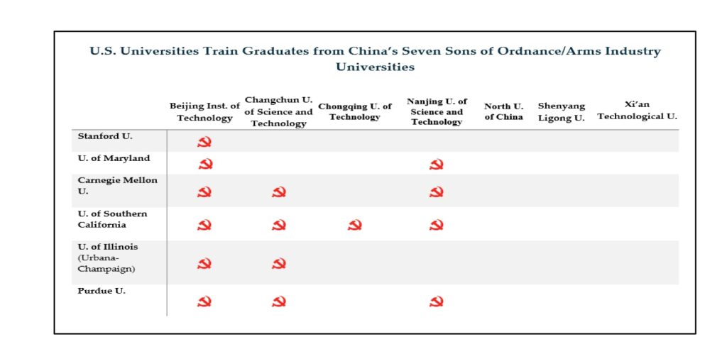 该报告针对6所美国大学——马里兰大学、伊利诺伊大学香槟分校、卡内基梅隆大学、南加州大学、普渡大学和斯坦福大学——展开调查,重点审查了中国留学生在科研活动、资金来源以及与中国军方或国防产业之间的关联。