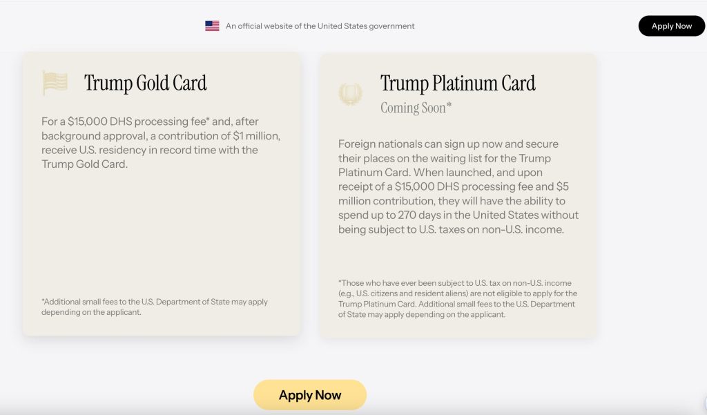 金卡开放申请:初次推出金卡计划,要求个人捐款100万美金或企业捐款200万美金可申请特朗普金卡,金卡享受绿卡权益,当前虽已开放申请,但并未明确审核标准和流程。