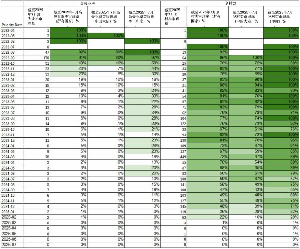 AIIA公布的移民局数据还显示了城市高失业项目以及乡村项目截止到2025年7月的审理进度: