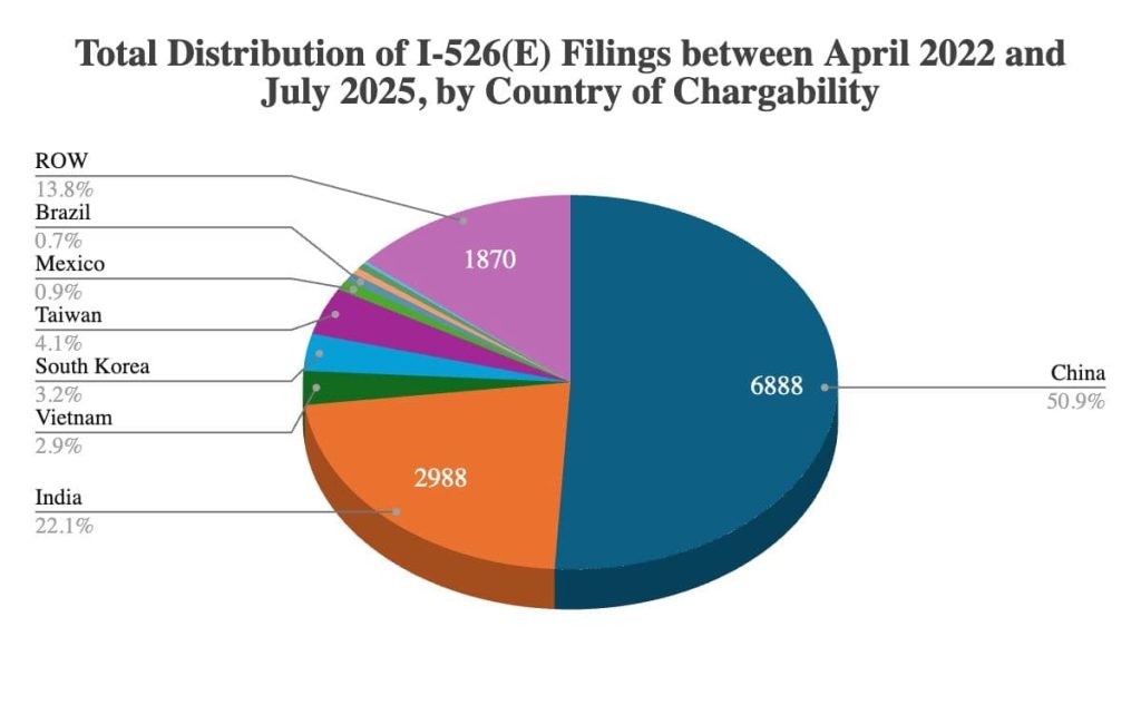 EB-5新法的主要申请人来自中国大陆、印度、其次是中国台湾地区、韩国、越南、巴西等;