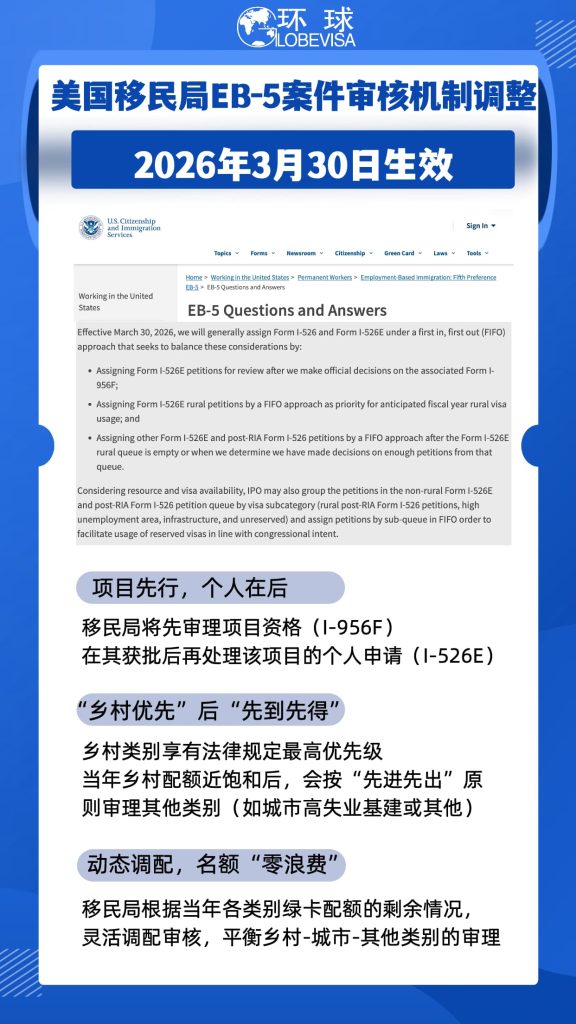 新近资讯——美国移民局(USCIS)发布重大公告:将全面启动EB-5案件的“分赛道、按比例、分批推进”审核机制。2026年3月30日后的审理将严格遵循以下逻辑:
