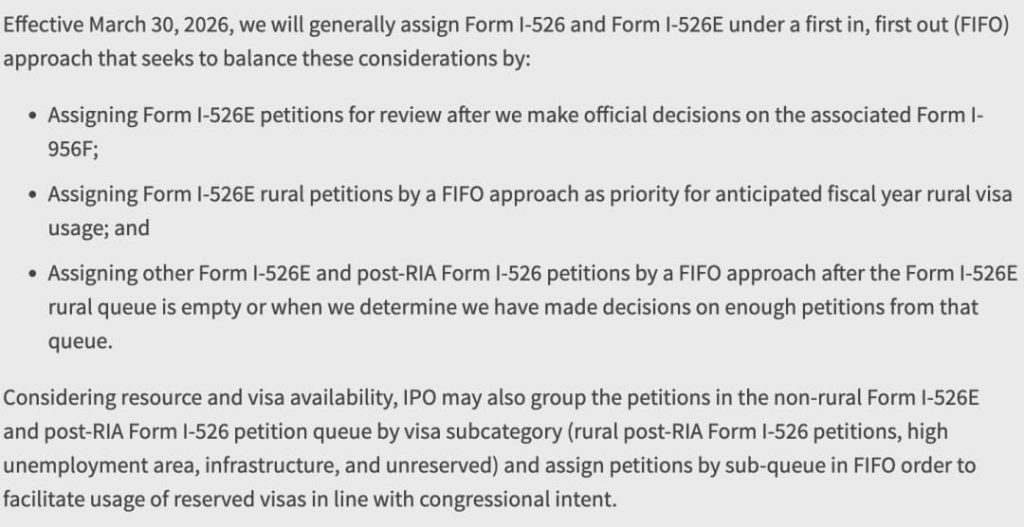 本周,美国移民局(USCIS)发布重大公告:从2026年3月30日起,将全面启动EB-5案件的“分赛道、按比例、分批推进”审核机制。 这意味着,过去“大锅饭”式的排队方式宣告终结,申请人的获批速度将直接取决于你所选的“赛道”。