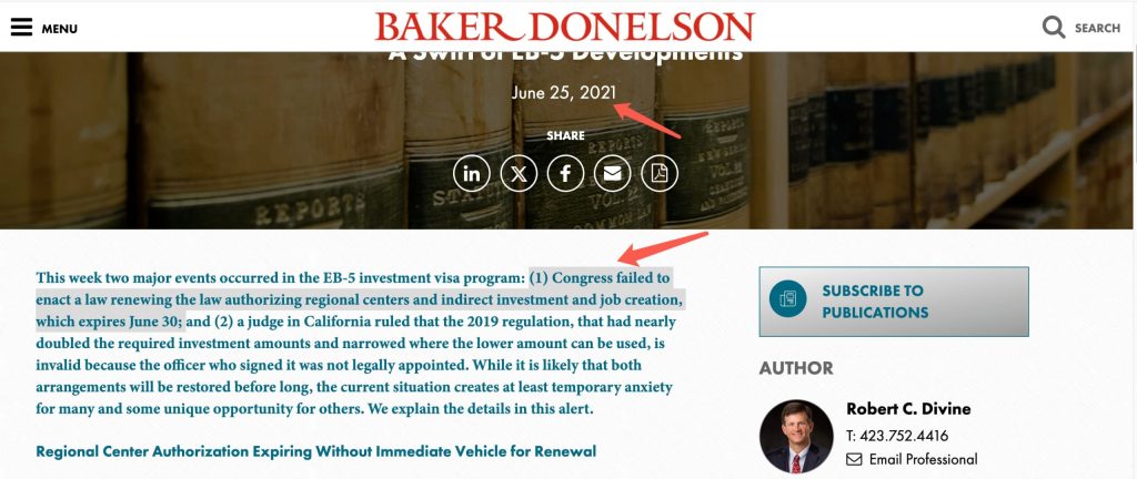 前美国移民官Robert Divine于2021年6月25日发布在媒体上的说明,确认EB5区域中心法案未通过国会批准。数据来源:https://www.bakerdonelson.com/a-swirl-of-eb-5-developments