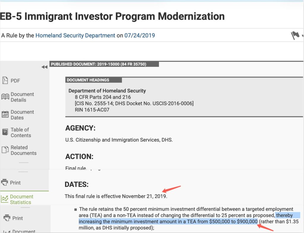 美国联邦公报官方文件:具有权威性的官方证据,白纸黑字写明了涨价至90万美金以及11月21日的生效日期。数据来源:https://www.federalregister.gov/documents/2019/07/24/2019-15000/eb-5-immigrant-investor-program-modernization