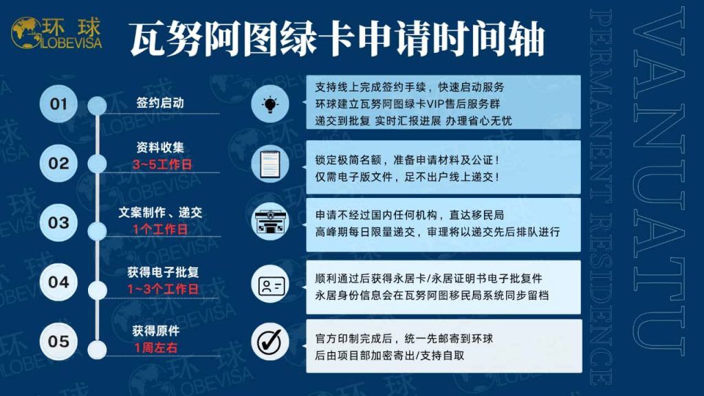 目前,瓦努阿图永居申请只需基础材料(护照、无犯罪证明、资产证明等),无需国际背调,无需登陆或录指纹,无任何语言学历要求,无需大额资金证明,流程简单快速,批复迅速。